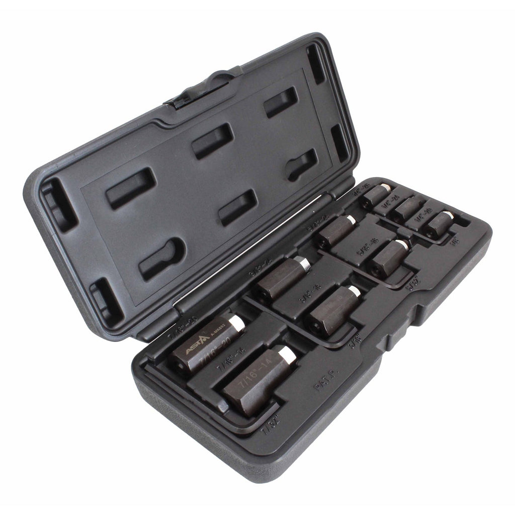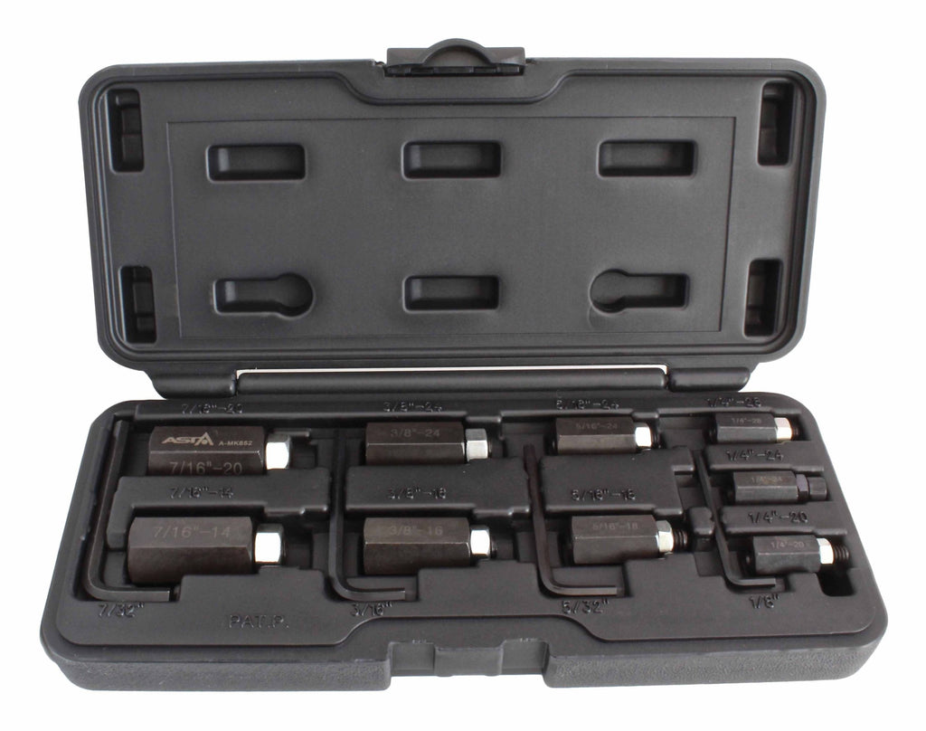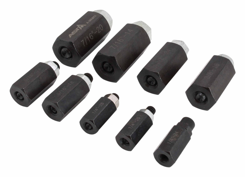 Sada na vyťahovanie skrutiek so závitom je určená na odstránenie skrutky bez poškodenia závitu. Modely extraktorov zahrnuté v sade sú: 852A, 852B, 852C. Veľkosti týchto modelov sa pohybujú od 7/16″ do 7/32″ pre 852A, od 3/8″ do 3/16″ pre 852B a od 5/16″ do 5/32″ pre 852C.