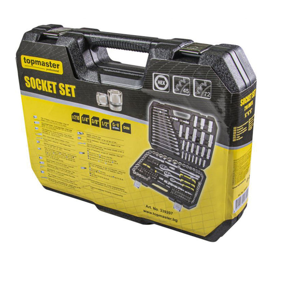 SADA NÁŘADÍ 216 KS TOPMASTER obsahuje 216 dílů vyrobených z vysoce kvalitní oceli s antikorozní úpravou. Všechny produkty jsou uskladněny v kufříku na nářadí, aby bylo možné je snadno přenášet.