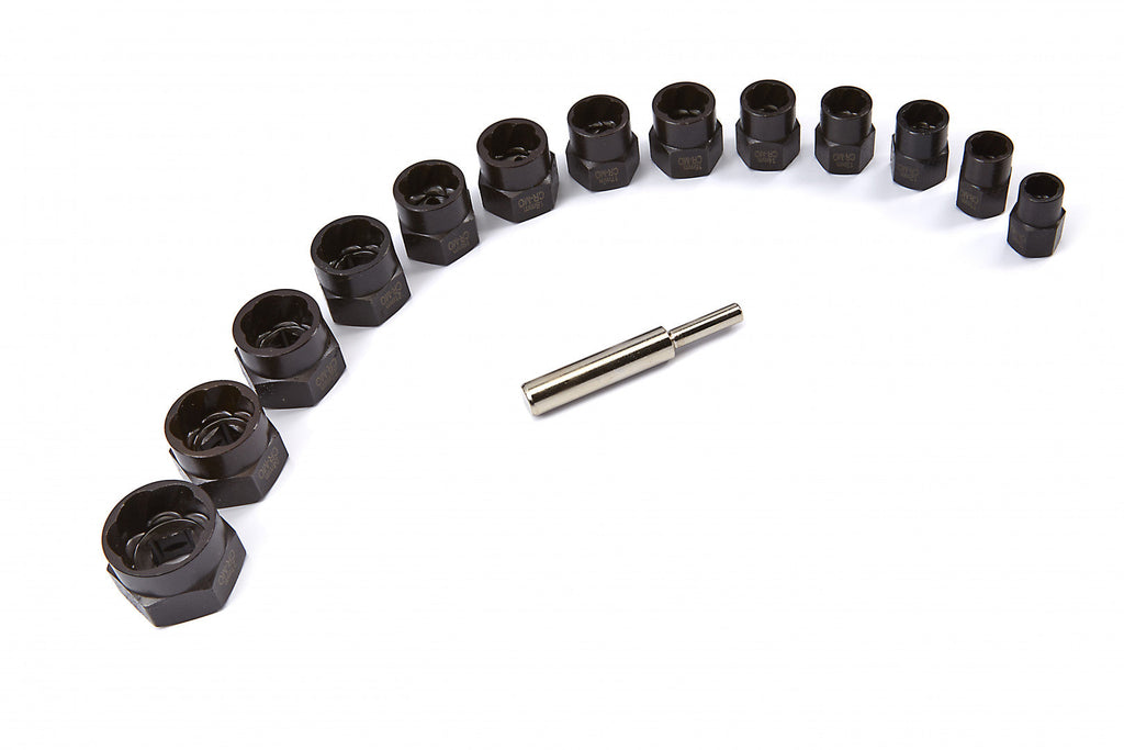 TENTO SADA NÁSTRČNÝCH KĽÚČOV NA OPOTREBOVANÉ A PROTIKRÁDEŽNÉ MATICE - ŠTVOREC 1/2 A 3/8 - 14 KS je vhodná pre rázové kľúče. Nástavce majú pripojenie 1/2" a 3/8".