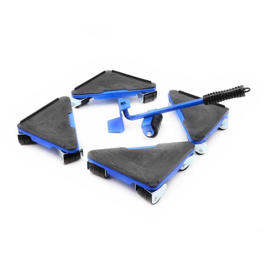 TÁTO SÚPRAVA PODPĚR NA ZDVIHANIE A PRESÚVANIE ŤAŽKÉHO NÁBYTKU 5 KS 300KG GEKO je navrhnutá na jednoduché premiestňovanie objemných a ťažkých predmetov v interiéri. Obsahuje štyri trojuholníkové plošiny na kolieskach z plastu, každá s nosnosťou 75 kg, čo umožňuje manipuláciu s kusmi nábytku s celkovou hmotnosťou až 300 kg.