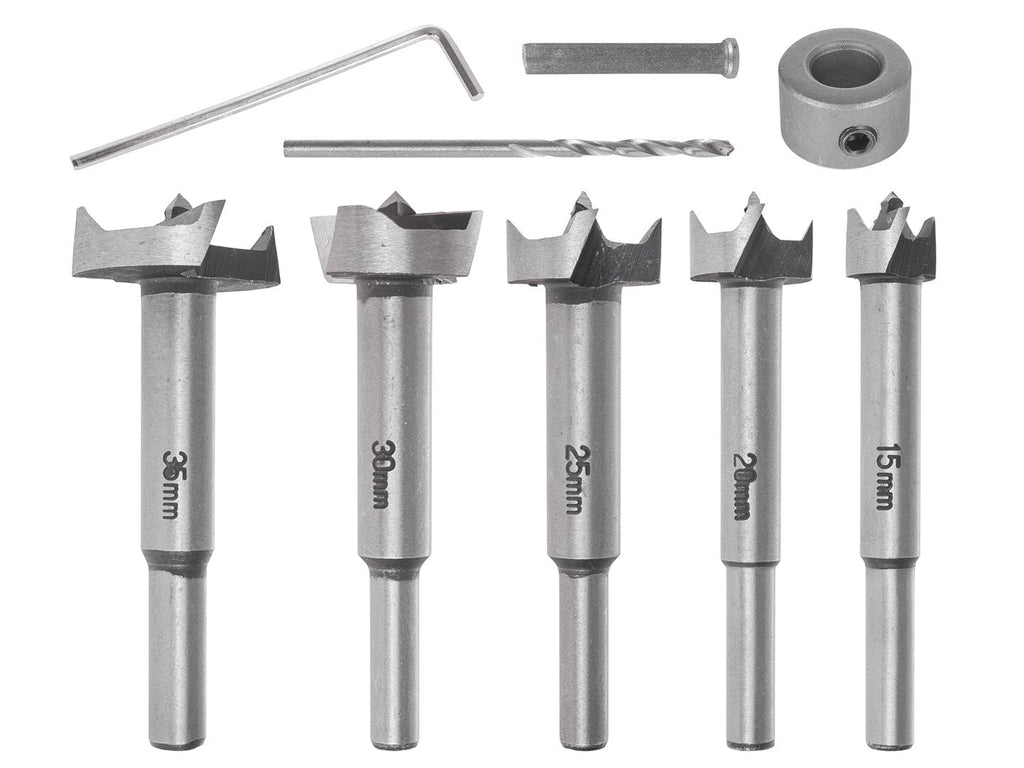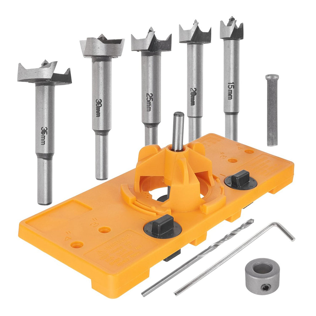 TÁTO SADA ŠABLÓNU A VODIACEHO PRÍSTROJA NA VŔTANIE A FRÉZOVANIE OTVOROV PRE PANTY, 5 KUSOV obsahuje vrtáky z HSS ocele s priemermi od 15 do 35 mm na vŕtanie otvorov pre pánty. V sade je tiež zahrnutý kovový vrták s priemerom 2 mm, ktorý môže byť použitý na pilotné otvory.