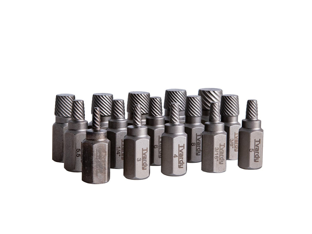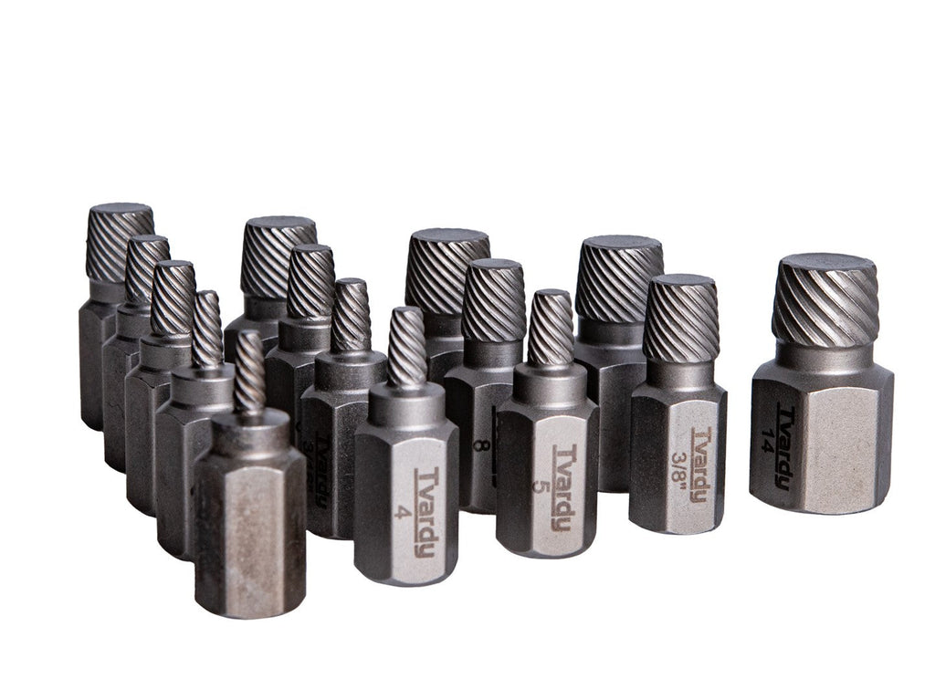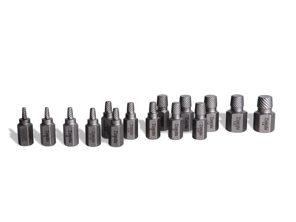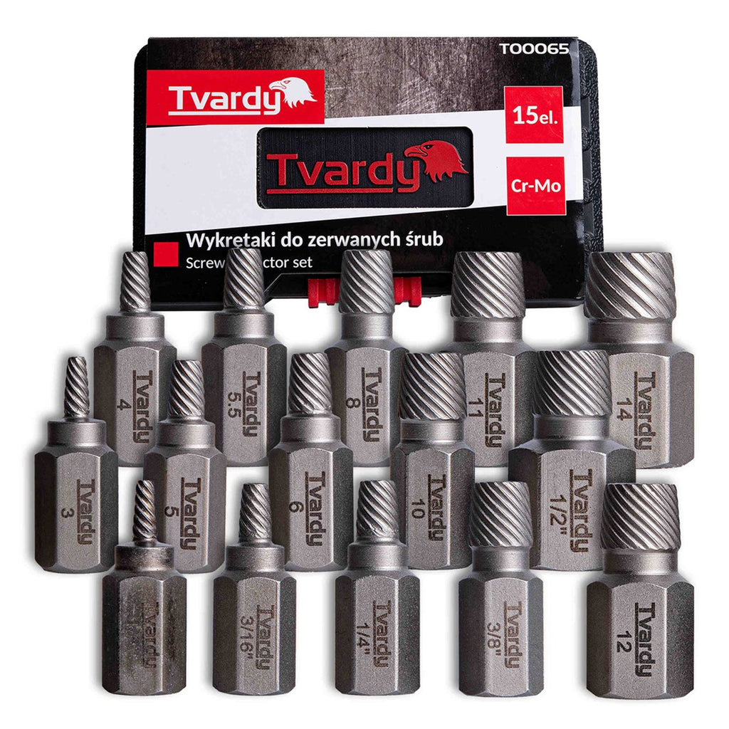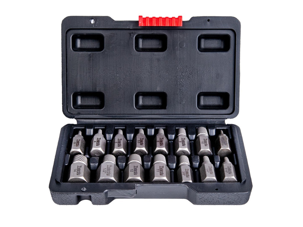 SÚPRAVA EXTRAKTOROV PRE OPOTREBOVANÉ A ZLOMENÉ SKRUTKY 15 DIELOV TVARDY obsahuje diely vyrobené z ocele Cr-Mo. Sada pokrýva široký rozsah veľkostí (HEX 12 mm, HEX 16 mm a HEX 20 mm). Veľkosti extraktorov sa pohybujú od 1/8"" do 14.