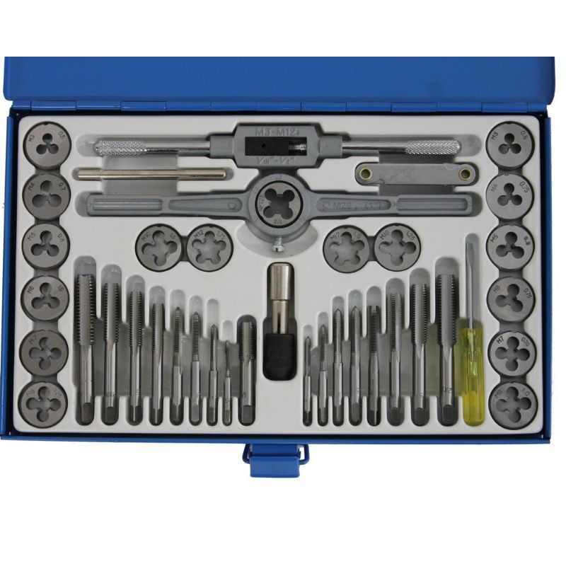 MATERIÁL SÚPRAVY ZÁVITNÍKOV A ZÁVITOVNÍC 40 KUSOV JMC je z ocele. Súprava obsahuje 17 závitníkov, 17 závitovníc, 1 držiak závitnice, 1 skrutkovač, 1 závit, 1 úložnú škatuľu, 1 kefu a 1 držiak v tvare T.