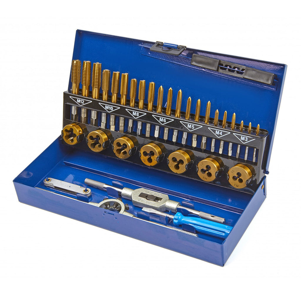 TÁTO SÚPRAVA ZÁVITNÍKOV A ZÁVITOVNÍC M3-M12 32 KUSOV HBM je dodávaná v oceľovej krabici a obsahuje 32 kusov. Má držiak na vložky, kľúč a meradlo na nastavenie. Všetky závitníky a závitovnice sú vyrobené z HSS.
