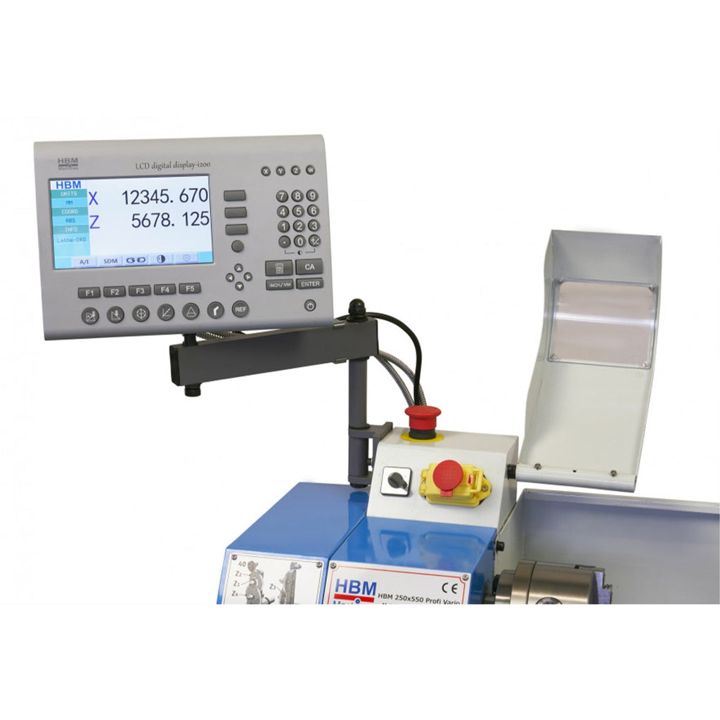 TENTO KOMPLETNÝ KOVOVÝ SÚSTRUH 250 X 550 VARIO S DIGITÁLNYM LCD ODPISOVÝM SYSTÉMOM je chránený proti nulovému napätiu, s dodatočnými krytmi pre skľučovadlo a hriadeľ, pričom pozdĺžny posuv je vybavený prepínačom vľavo/vpravo.