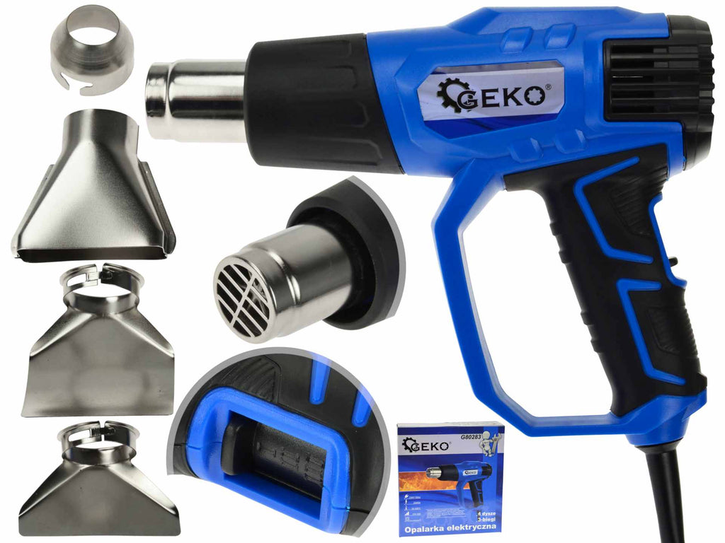 TEPLOVZDUŠNÁ PIŠTOĽ 2000 W GEKO je určená na odstraňovanie farby a laku, tvarovanie a zváranie plastových rúr, rozmrazovanie zamrznutých vodovodných potrubí (ktoré nie sú z plastu), odstraňovanie nálepiek, prácu so zmršťovacími bužírkami a ďalšie údržbárske či hobby práce.