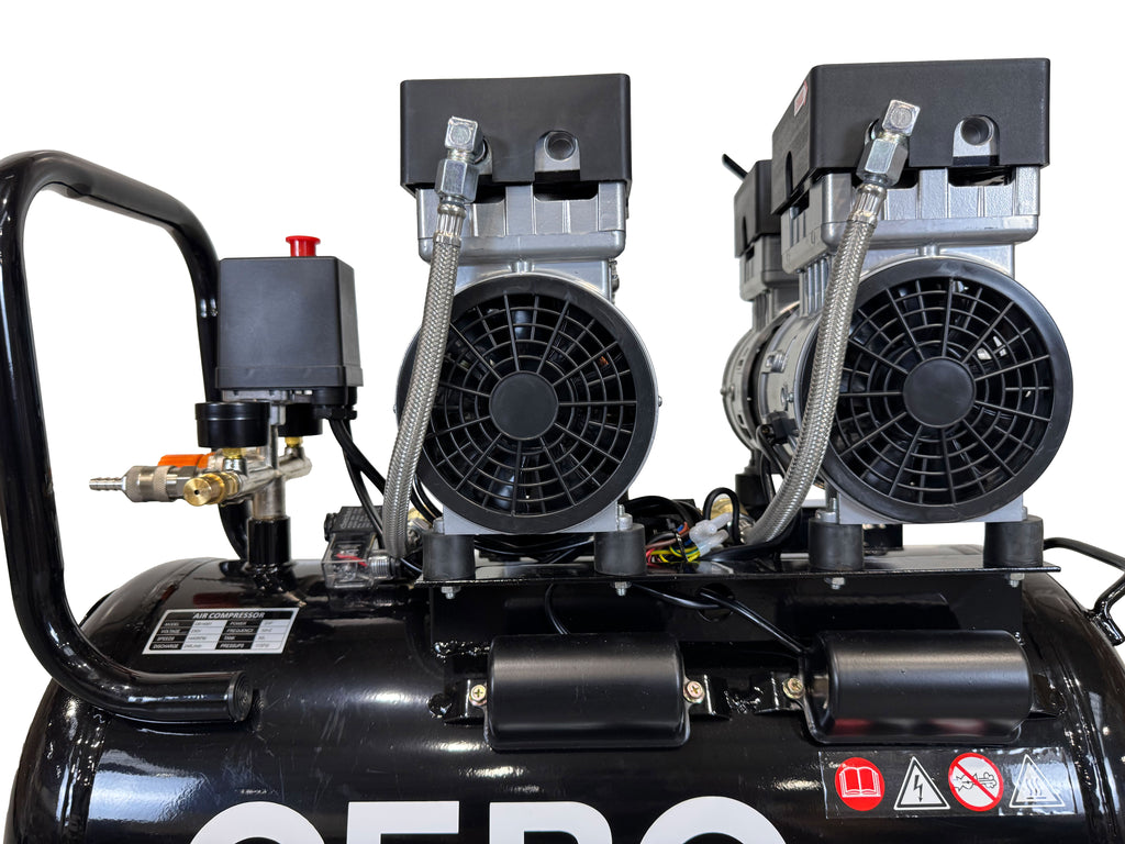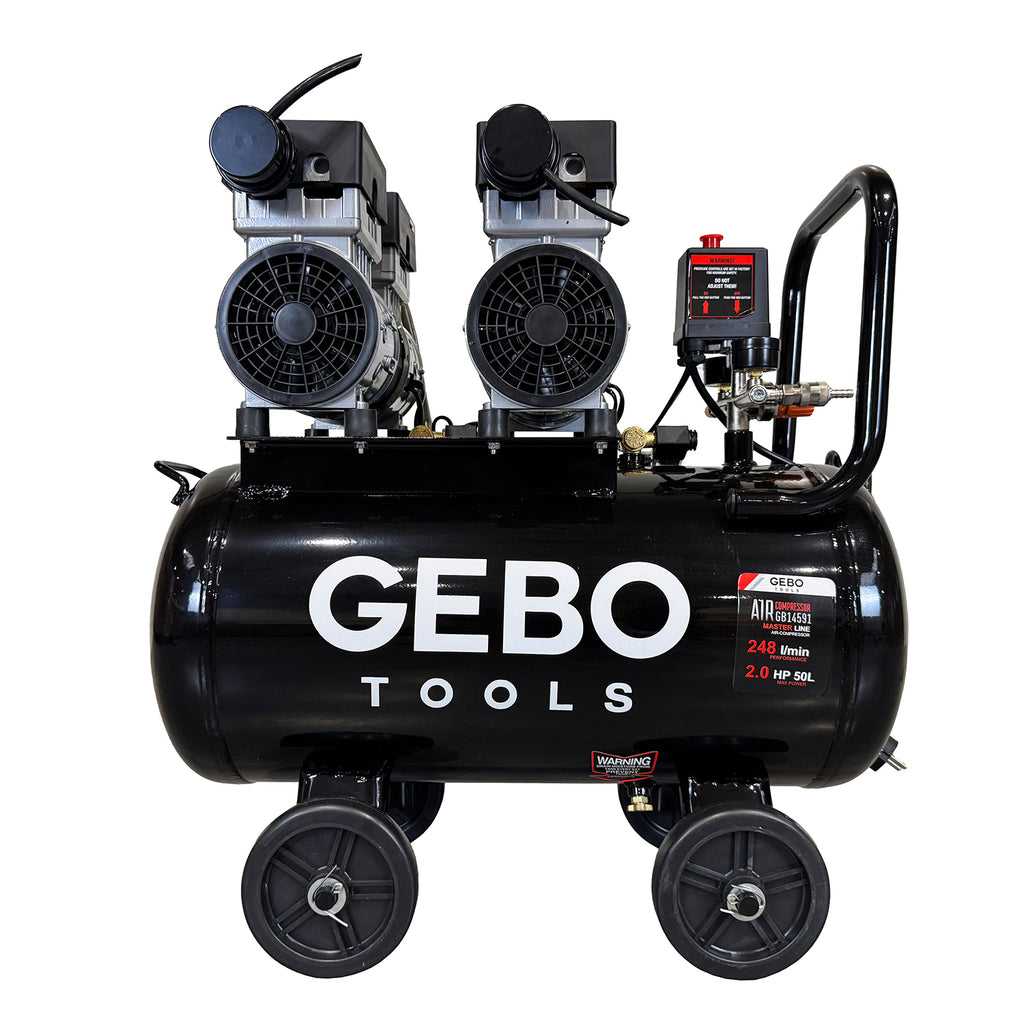 TICHÝ BEZOLEJOVÝ KOMPRESOR 50L GEBO TOOLS má kapacitu nádrže 50 litrov a pracuje s maximálnym prevádzkovým tlakom 8 barov. Je vybavený motorom s výkonom 2 hp a štyrmi valcami. Napájanie je 220 V / 50 Hz. Rýchlosť otáčok motora je 1400 ot./min.