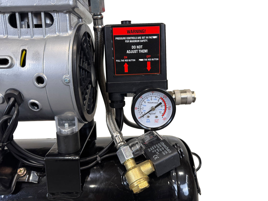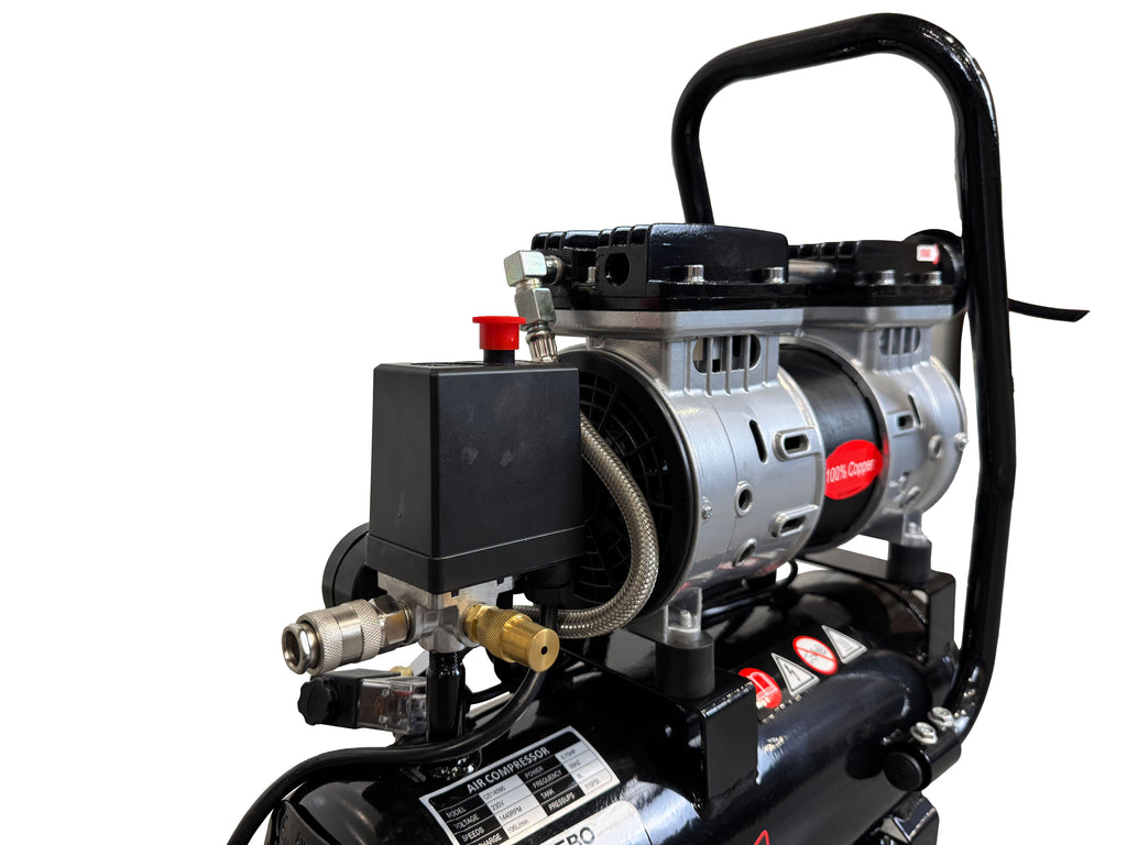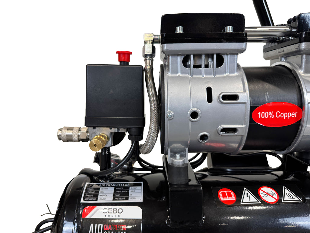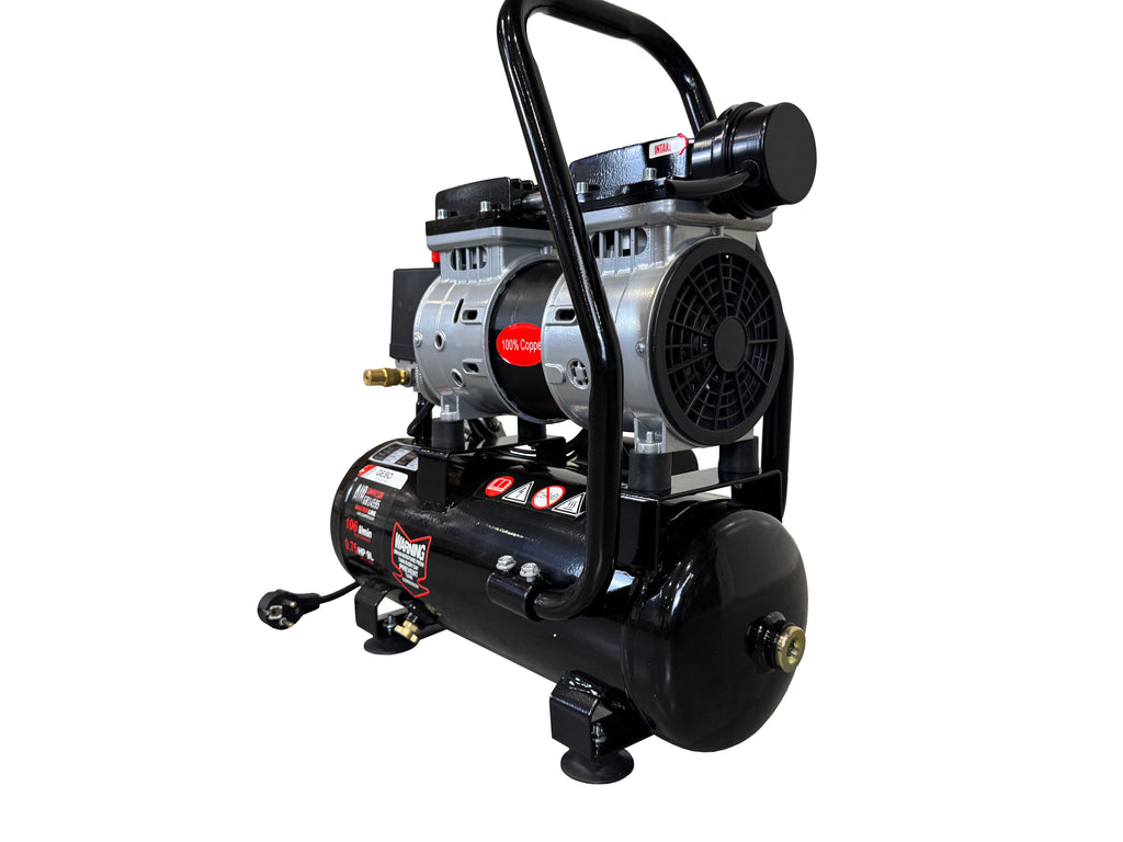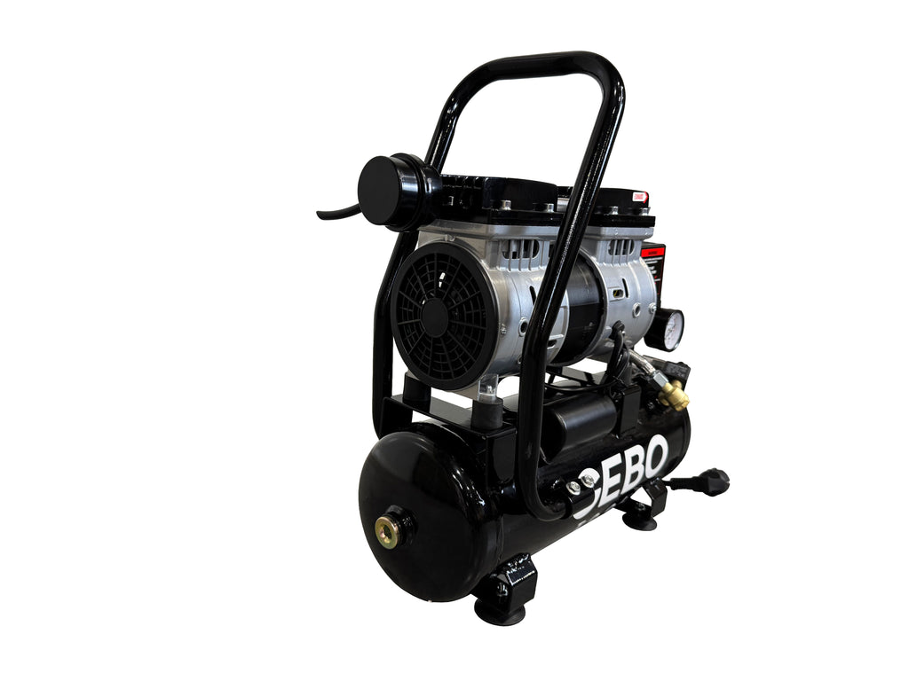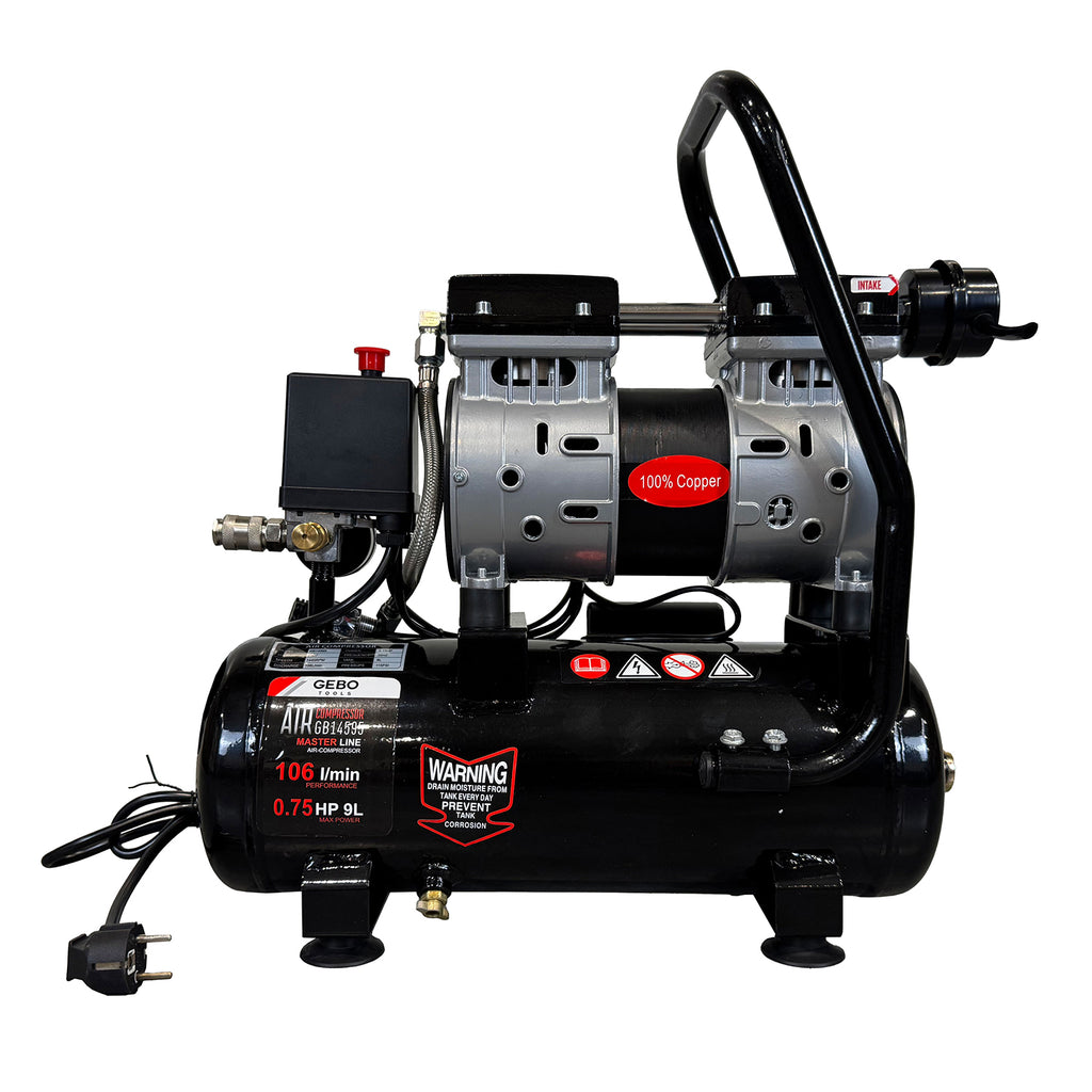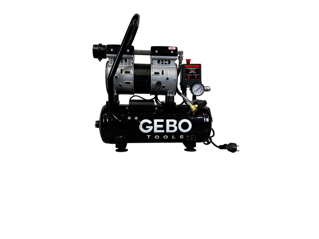 TICHÝ BEZOLEJOVÝ KOMPRESOR 9L GEBO TOOLS má objem nádrže 9 litrov a pracuje s maximálnym prevádzkovým tlakom 8 barov. Je vybavený motorom s výkonom 550 W a dvoma valcami. Napájacie napätie je 220 V s frekvenciou 50 Hz. Rýchlosť otáčok motora je 1400 ot./min.