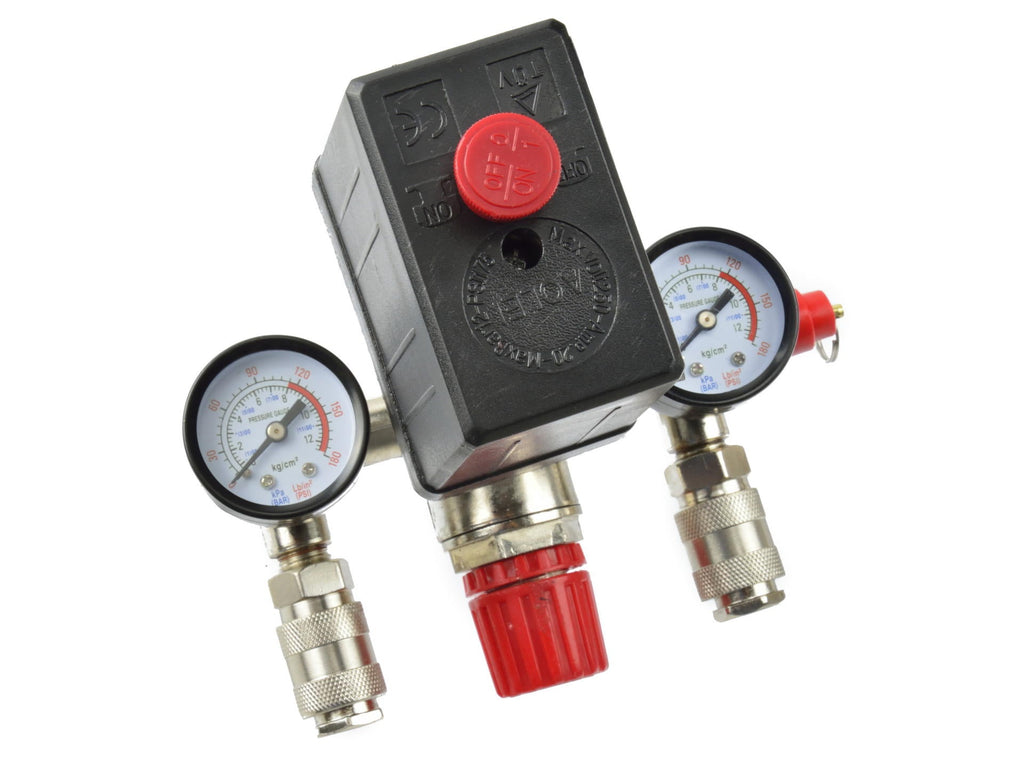 Tlakový spínač pre jednofázový kompresor s regulátorom a manometrami geko