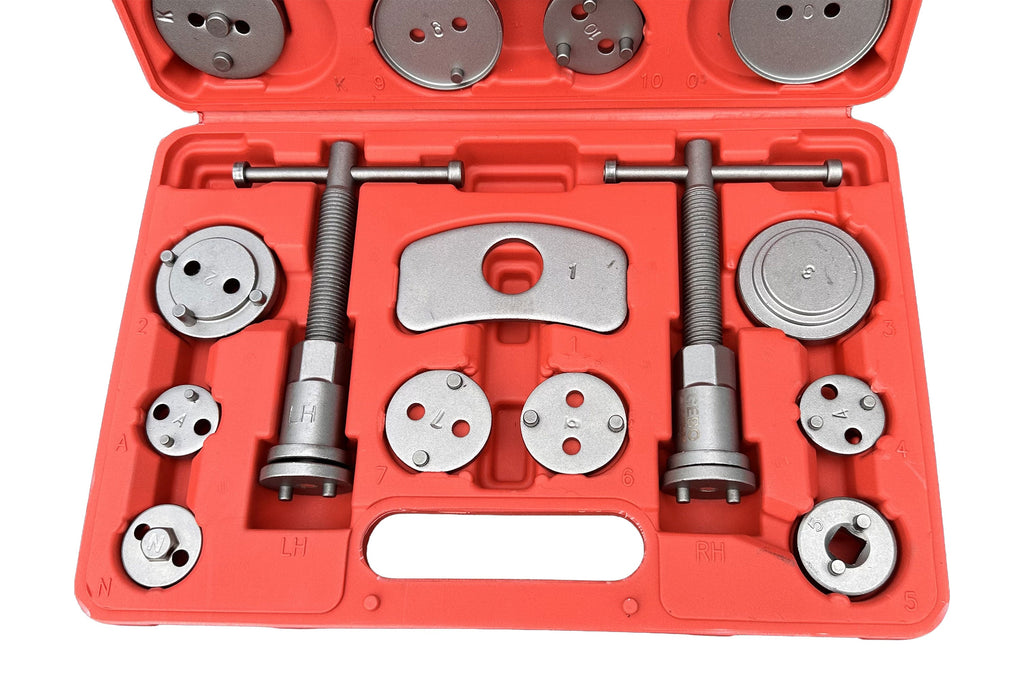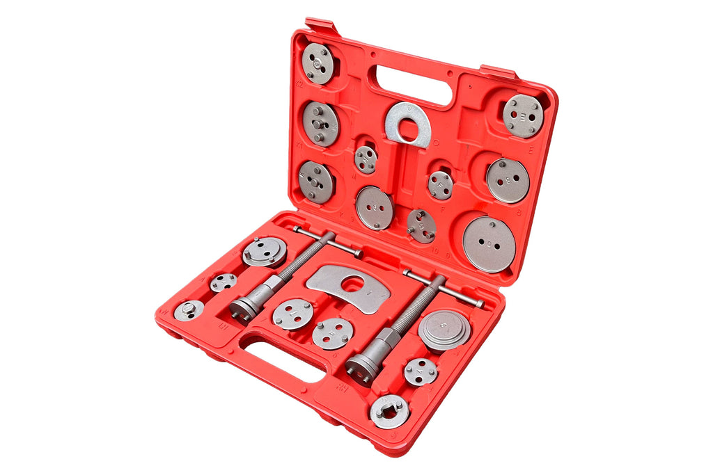 SADA NA BRZDOVÉ STRMENE A PIESTY UNIVERZÁLNA 22 DIELNA GEBO TOOLS je kompatibilná s väčšinou vozidiel. Presné nasadenie adaptéra a piestu zaručuje správne zasunutie piestu do valca brzdového strmeňa. Sada obsahuje pomocnú tyč na udržanie lisu proti sedlu brzdového strmeňa