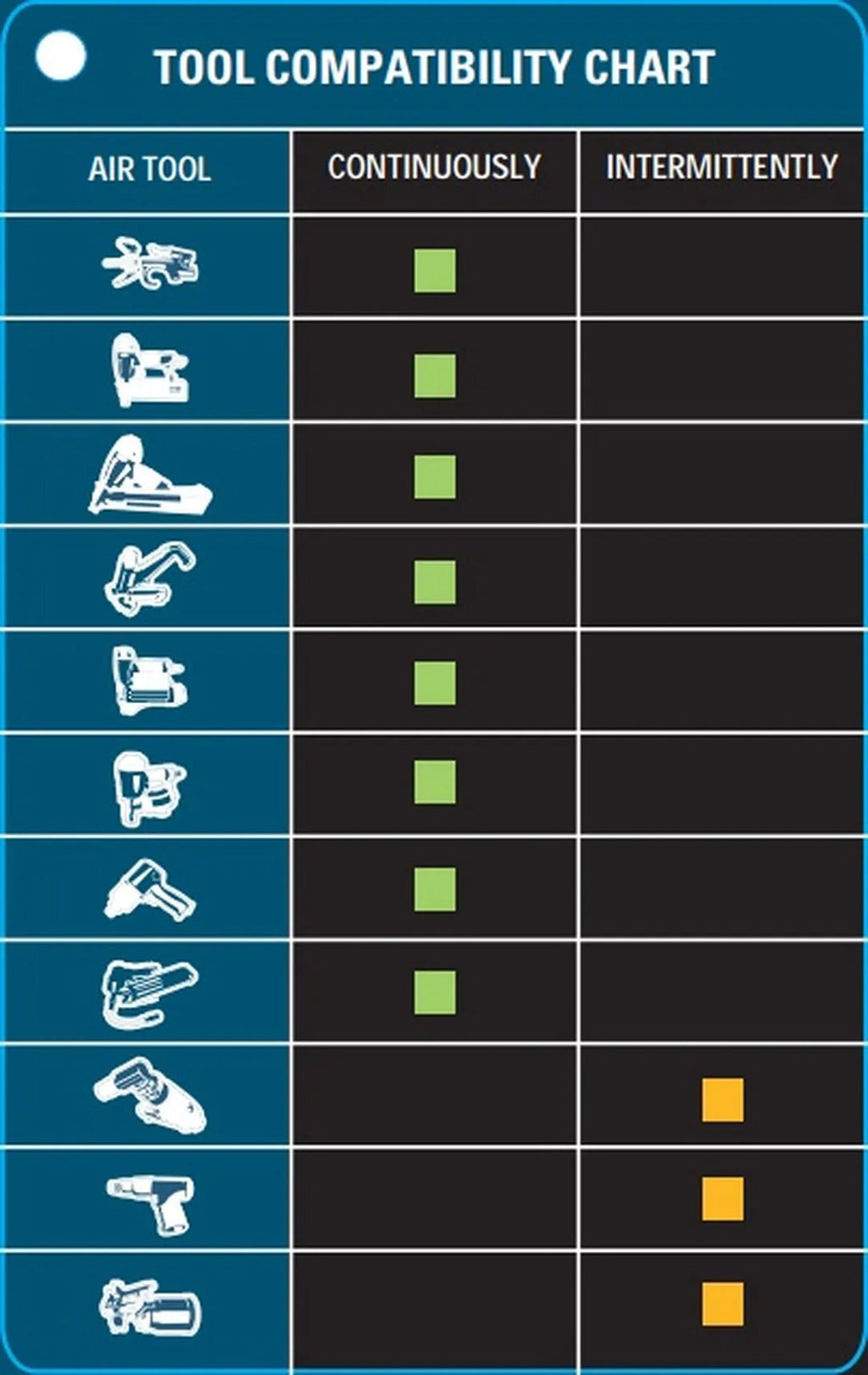 Jeho kompaktný vertikálny dizajn šetrí miesto, zatiaľ čo 50-litrová nádrž umožňuje dlhšiu prevádzku bez častých prerušení. Vďaka bezolejovej technológii je prevádzka čistá a vyžaduje minimálnu údržbu. Hlučnosť dosahuje 85 dB a trieda ochrany je IP30. Hmotnosť kompresora je 23,8 kg.