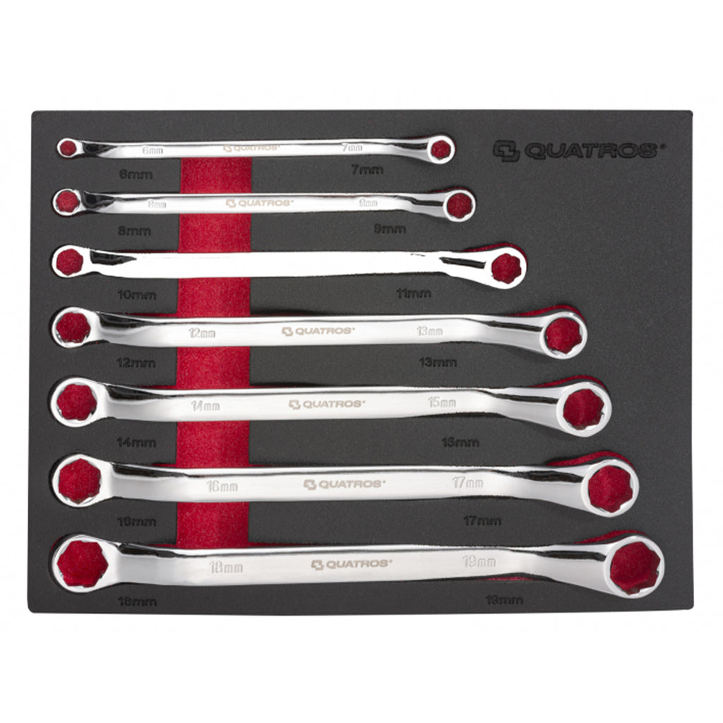 Súprava zahŕňa veľkosti 6x7 mm, 8x9 mm, 10x12 mm, 11x13 mm, 14x15 mm, 16x17 mm a 18x19 mm. Kľúče sú vyrobené z chróm-vanádiovej ocele (Cr-V) a majú chrómovaný povrch s leštenou zrkadlovou úpravou.