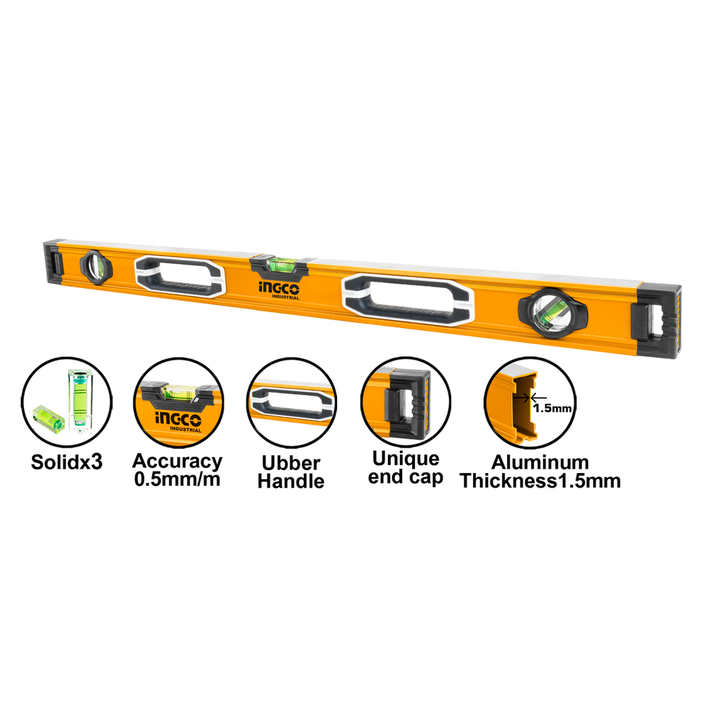 Táto NIVELA VODOVÁHA Z HLINÍKA 100CM INGCO je vhodný nástroj na kontrolu horizontality alebo vertikality objektu. Konce majú nárazuvzdorné krytky. Vodováha je vybavená ukazovateľmi z akrylátového skla, ktoré sú prakticky nerozbitné a odolné proti únikom počas bežného používania.