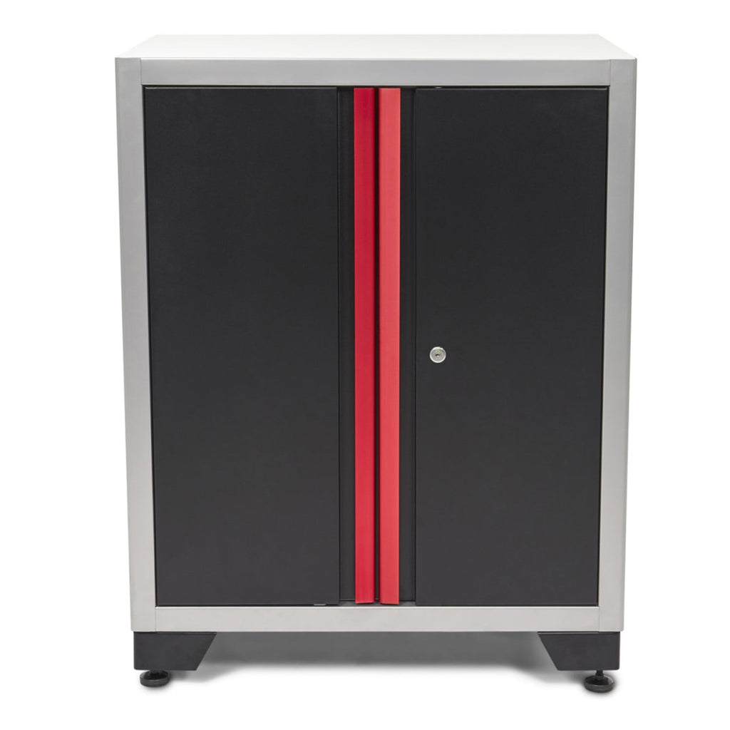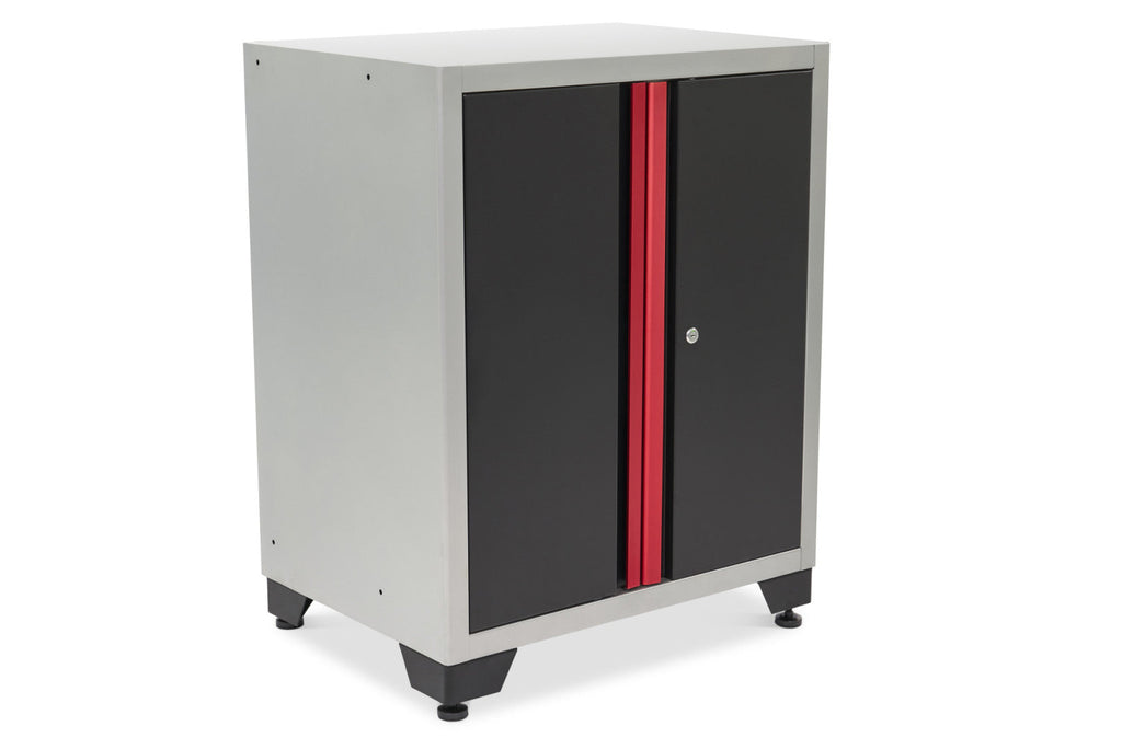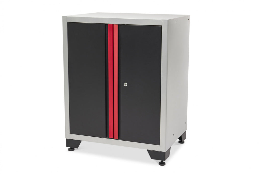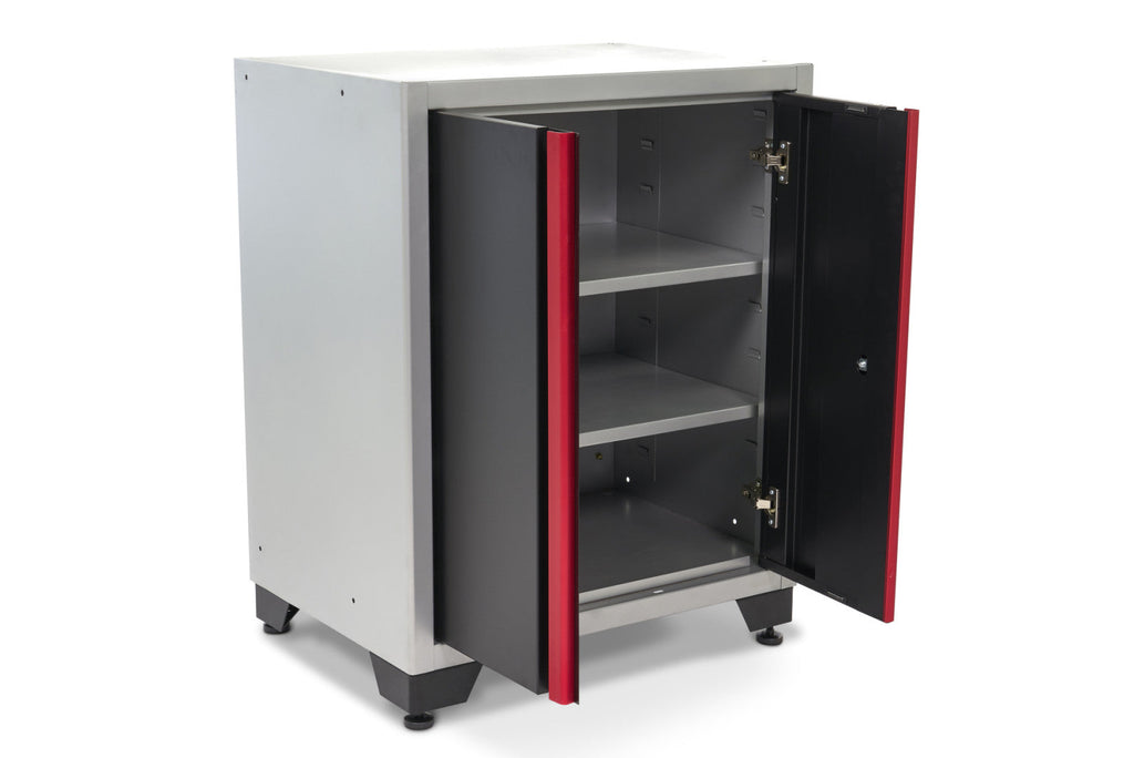 TÁTO DIELENSKÁ SKRINKA S 2 DVERAMI PRE SERVIS je pevná zváraná konštrukcia, ktorá nevyžaduje montáž. Pomocou našich produktov si môžete zostaviť skrinku tak veľkú, ako potrebujete. Je presne vhodná pre vašu dielňu a vďaka elegantnému dizajnu dodá pracovnému priestoru profesionálny vzhľad. Steny systému sú vo farbe kovovo sivej (striebornej). Zásuvky a dvere sú v matnej čiernej farbe a rukoväte a horné časti dvierok zásuviek sú vždy vyrobené z krásneho profilu z eloxovaného červeného hliníka, čo tomuto systému dodáva veľmi sofistikovaný a elegantný vzhľad.
