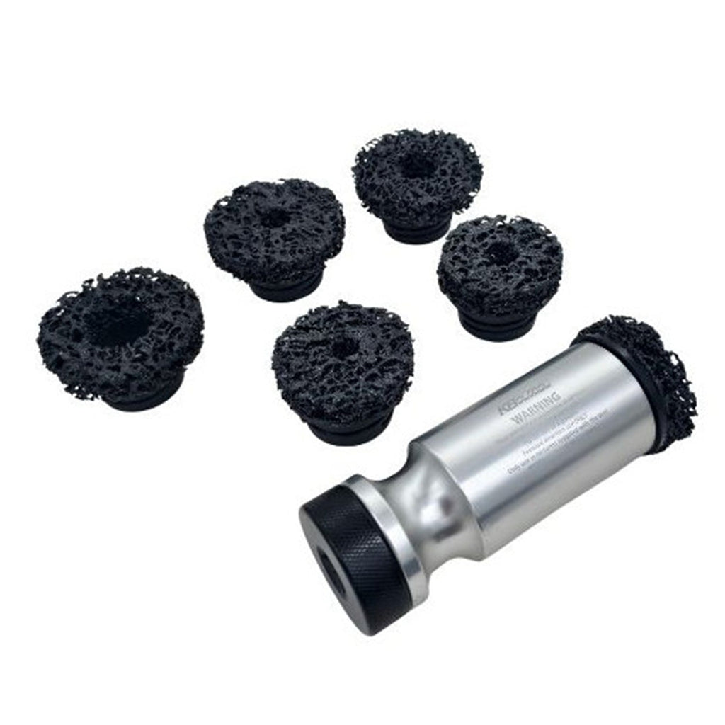 TOTO ZARIADENIE NA ČISTENIE SKRUTIEK A NÁBOJOV KOMPATIBILNÉ S RÁZOVÝMI UŤAHOVÁKMI je určené na čistenie skrutiek a nábojov, pričom je kompatibilné s rázovými uťahovákmi a pneumatickými vŕtačkami. Konštrukcia umožňuje efektívny prenos sily generovanej použitými nástrojmi, čo uľahčuje odstraňovanie usadenín z kovových povrchov. Môže sa používať na skrutky s priemerom až do 28 mm a maximálnou dĺžkou 80 mm.