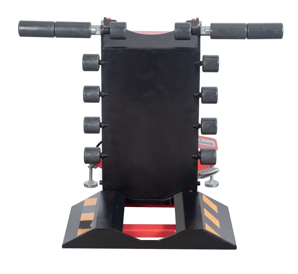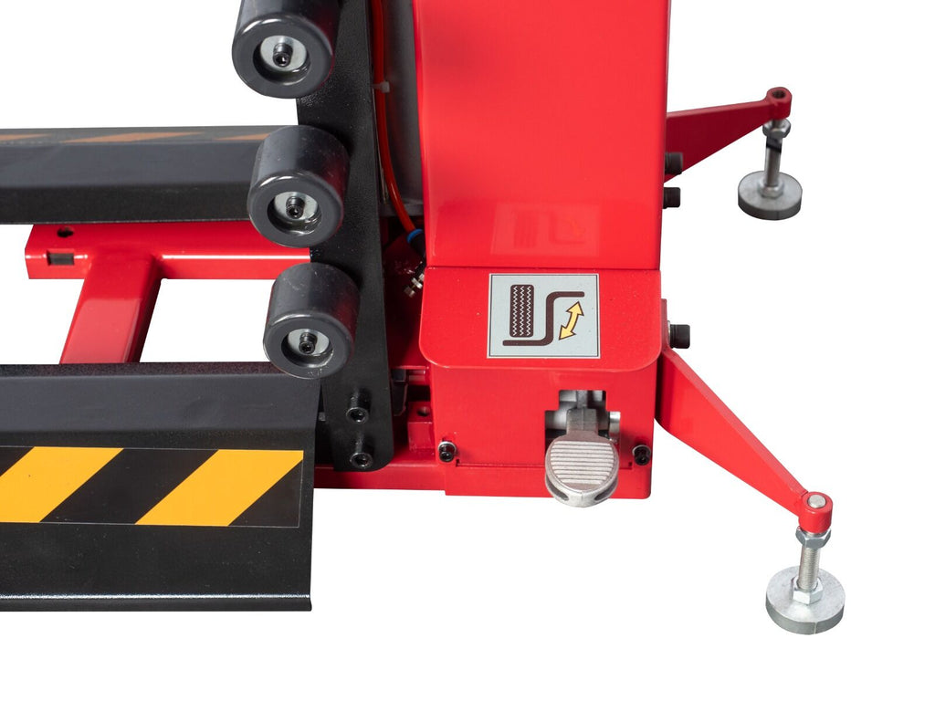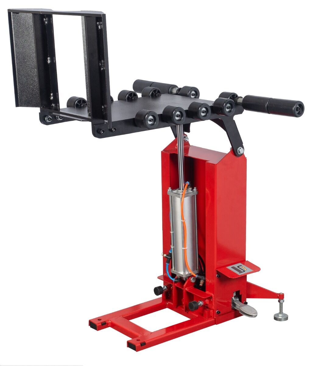 Ovládanie sa vykonáva pomocou pedála, čo umožňuje kontrolu bez použitia rúk. V hornej polohe integrované valčeky uľahčujú horizontálnu manipuláciu s kolesami, čím zabezpečujú presné zarovnanie s prezúvačkou. Čistá hmotnosť zariadenia je 43 kg, hrubá hmotnosť 53 kg. Rozmery balenia sú 640 mm x 480 mm x 410 mm.