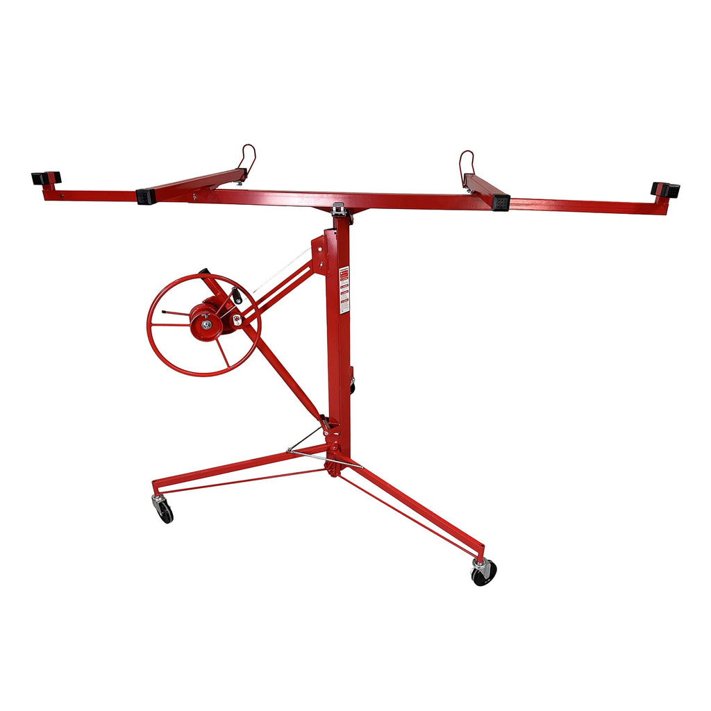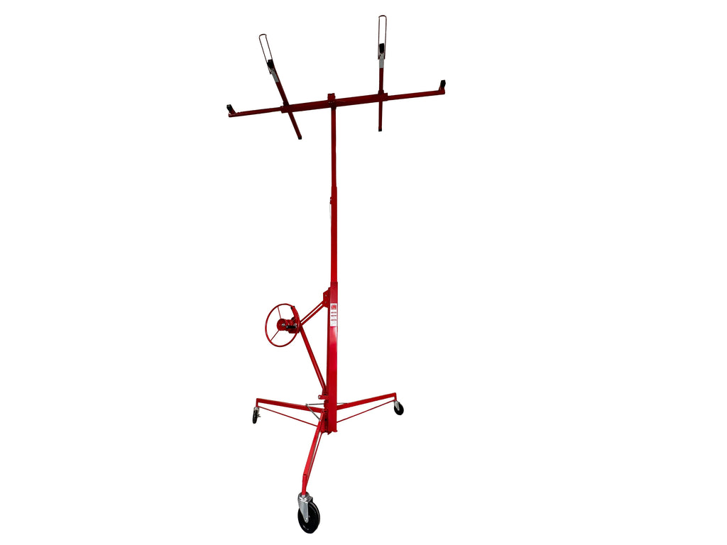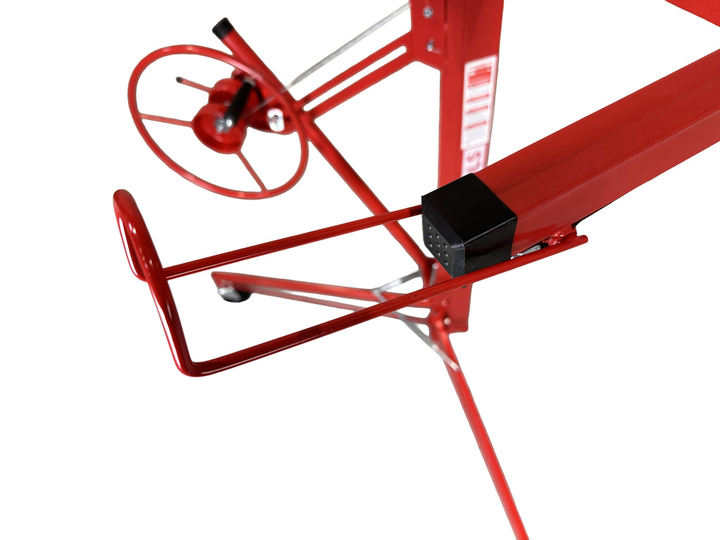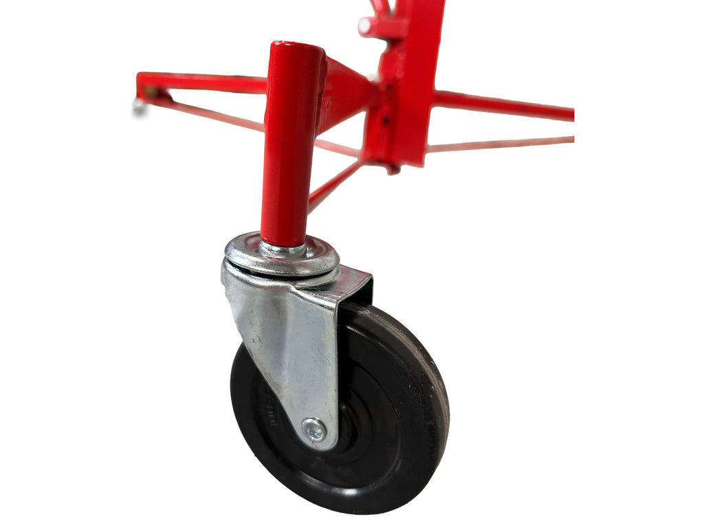 ZARIADENIE NA ZDVIHANIE SADROKARTÓNOVÝCH ALEBO OSB DOSIEK je určené na manipuláciu a montáž sadrokartónových alebo OSB dosiek, pričom uľahčuje ich zdvíhanie až do maximálnej výšky 335 cm. Minimálna pracovná výška je 122 cm a maximálny rozmer kompatibilnej dosky je 128 × 488 cm. Maximálna nosnosť je 68 kg. Zariadenie je vybavené otočným držiakom na panely, automatickou brzdou pre bezpečnosť počas používania a PVC kolieskami s priemerom 125 mm pre jednoduchý pohyb.